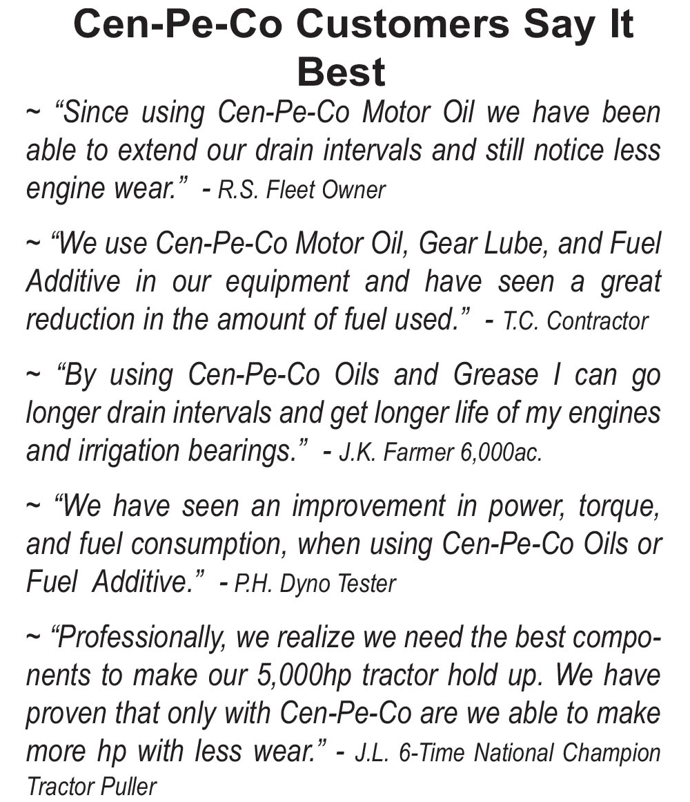 Central Petroleum Company has scientifically formulated Cen-Pe-Co Engine Oils for superior performance in heavy duty engines since 1911.